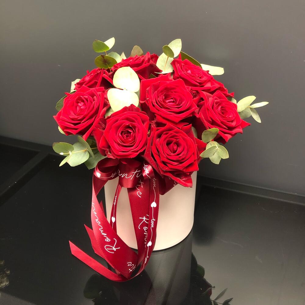 Стильная коробочка роз с эвкалиптом станет приятным подарком на любой повод!