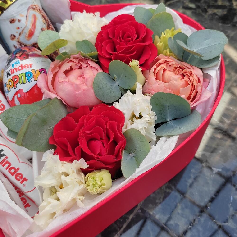Лизиантус – 1 шт.Эвкалипт – 1 шт.Роза – 2 шт.Тишью – 2 шт.Роза кустовая пионовидная – 1 шт.Киндер сюрприз – 1 шт.Коробка сердце – 1 шт.Киндер шоколад – 7 шт.Киндер макси – 1 шт.Киндер молочный ломтик – 1 шт.