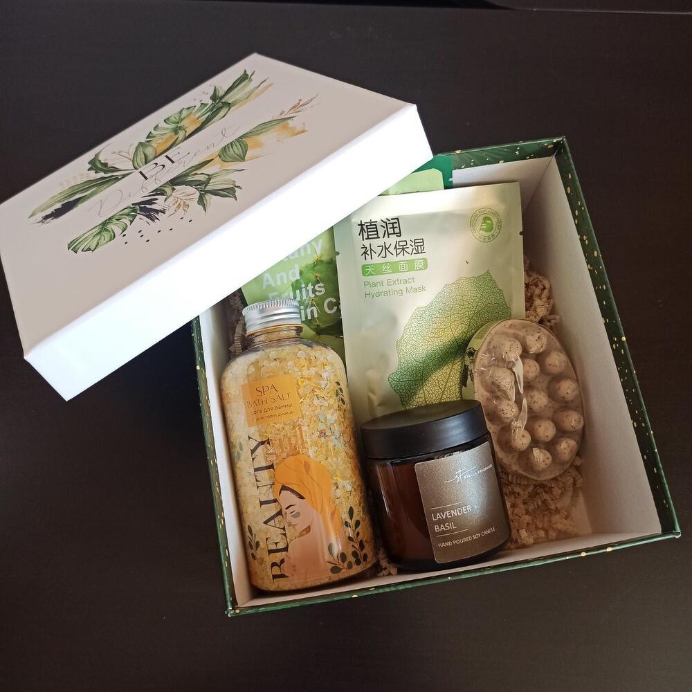 Коробка подарочная – 1 шт.свеча ароматическая лаванда и базилик – 1 шт.маска тканевая для лица – 3 шт.массажное мыло-скраб – 1 шт.расслабляющая соль для ванной с лепестками душицы – 1 шт.