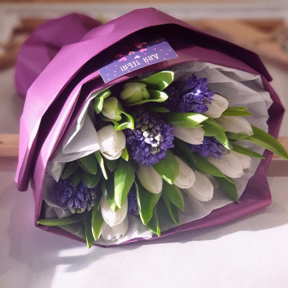 Лента атласная – 1 шт.Пленка матовая – 2 шт.Открыточка с вашими пожеланиями – 1 шт.Тишью белое – 3 шт.тюльпаны белые голландия – 12 шт.гиацинты синие – 5 шт.