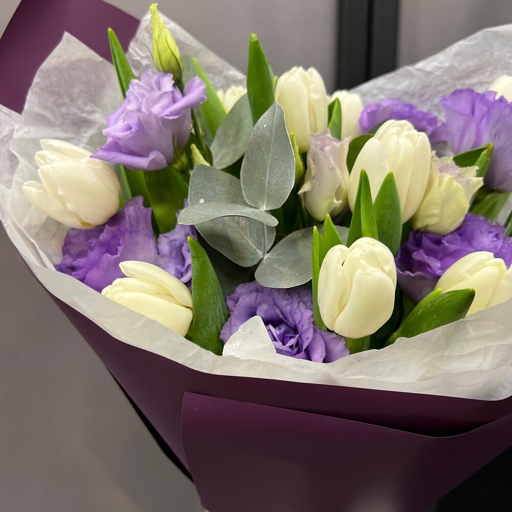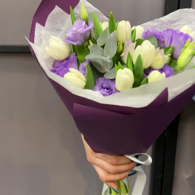 Тюльпан – 9 шт.эустома махровая – 2 шт.Эвкалипт – 1 шт.Тишью – 2 шт.Пленка матовая – 2 шт.Лента атласная – 2 шт.