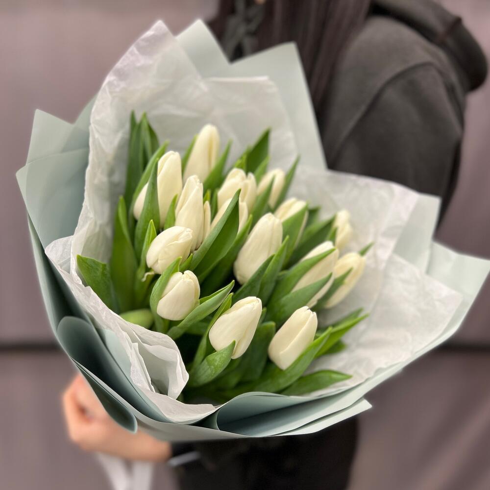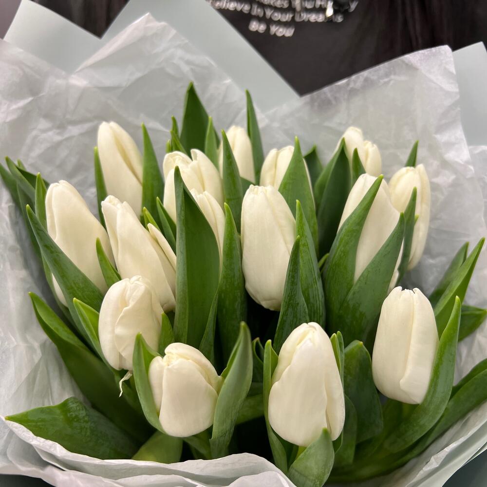 Лента атласная – 2 шт.Тишью – 2 шт.Тюльпан белый – 15 шт.Пленка матовая – 4 шт.