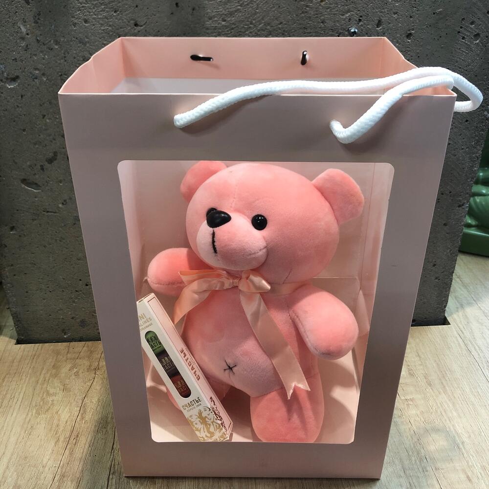 Тюльпан – 11 шт.Упаковка дизайнерская – 1 шт.Мишка плюшевый – 1 шт.конфеты счастье – 1 шт.Пакет подарочный – 1 шт.