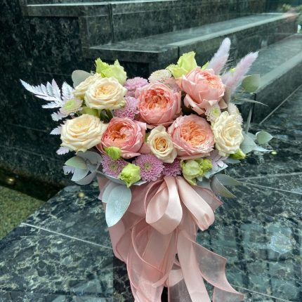 Шляпная коробка с пионовидными лилиями, розами и голубым оксипеталумом